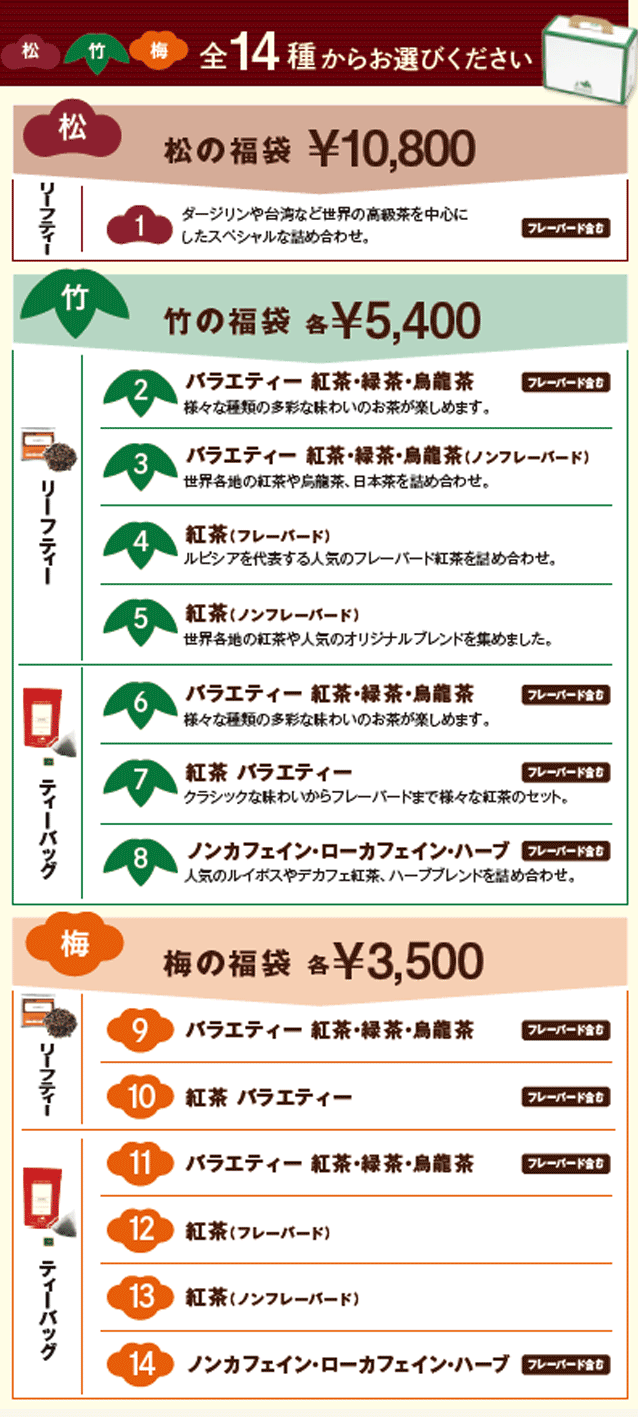 - 福袋は特別価格商品のため、キャンペーン、ルピシア会員5%割引優待および、お買い上げ金額の累積の対象外とさせていただきます。ご了承ください。