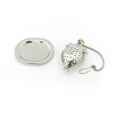いちご形の茶こし(トレー付)です。茶こしの中に茶葉を入れるだけで、カップやマグでリーフティーが簡単にいれられます。