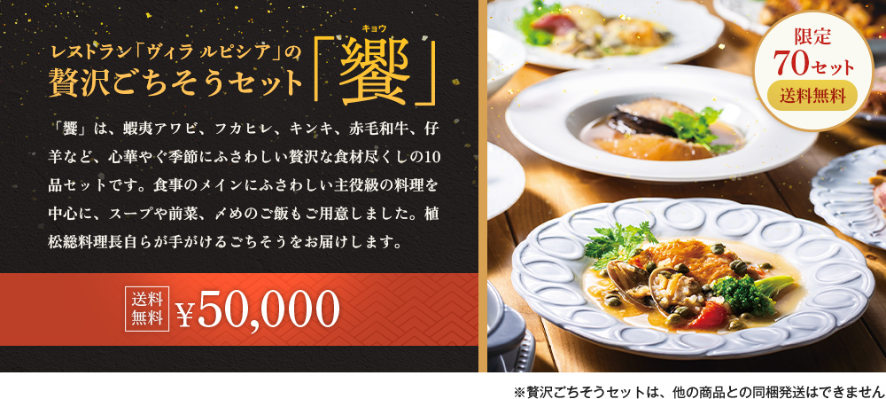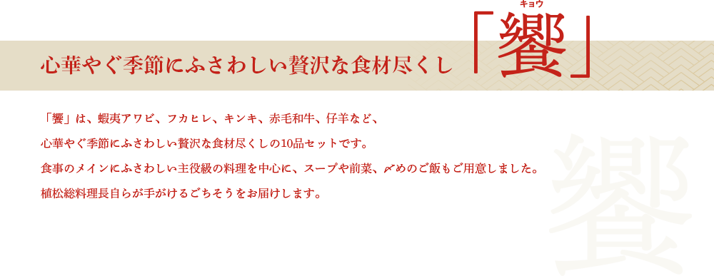 「饗」は蝦夷アワビ、フカヒレ、キンキ、黒毛和牛、仔羊など、心華やぐ季節にふさわしい贅沢な食材尽くしの2名様用の10品セットです。1日1〜2品ずつお楽しみいただけるよう、食事のメイン料理を中心に、スープや前菜、海鮮丼の素もご用意しました。