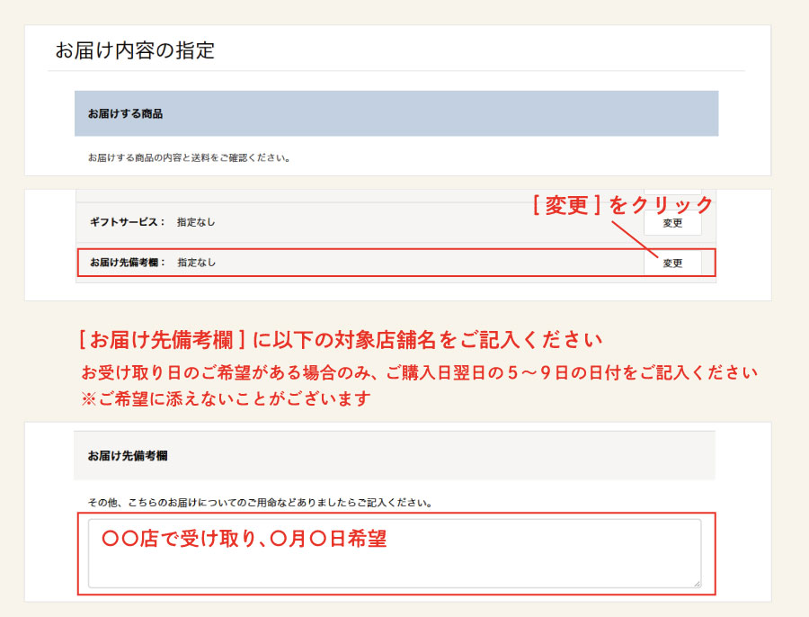 A「お届け備考欄」に、受け取り希望店舗名、受け取りご希望日をご記入ください。