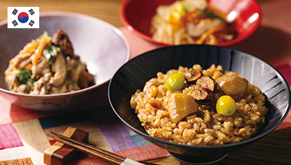 NK31397 韓国選択する韓国伝統菓子「ヤクシク」をアレンジしたおこわに、「プルコギ」と「チャプチェ」のおかずを加えました。野菜をたっぷり摂れるのがうれしいお弁当です。