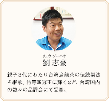 凍頂烏龍の産地・鹿谷郷(ルーグーゴウ)に茶園を持ち、栽培から製茶まで行う劉志豪(リュウ ジーハオ)さんは、ルピシアが信頼を寄せる生産者の一人。取材班の訪問を快く迎えてくださいました。