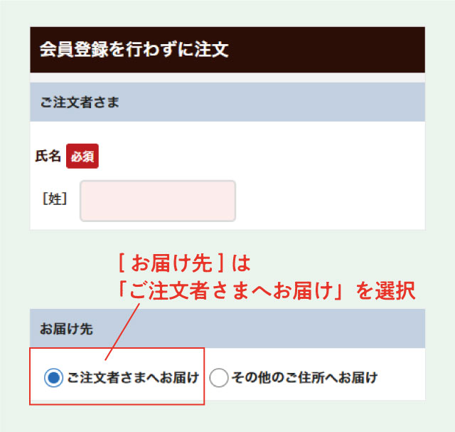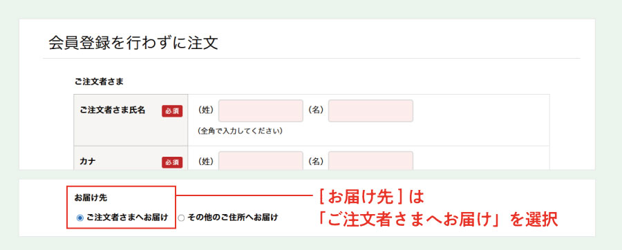 ◆初めてのご利用の方(会員登録を行わずにご注文のお客様)は、ご注文主様のご住所をご記入の上、お届け先に「ご注文者さま」をご指定ください。