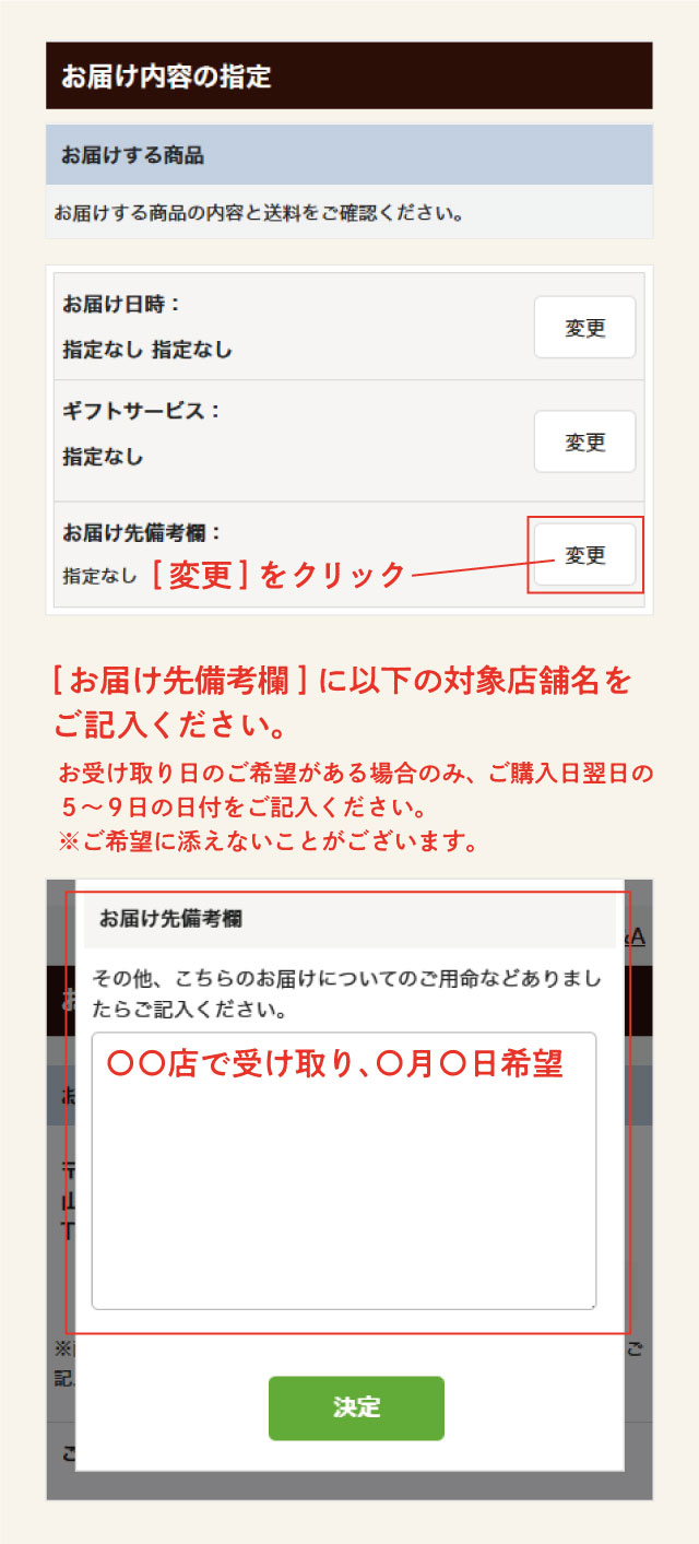A「お届け備考欄」に、受け取り希望店舗名、受け取りご希望日をご記入ください。