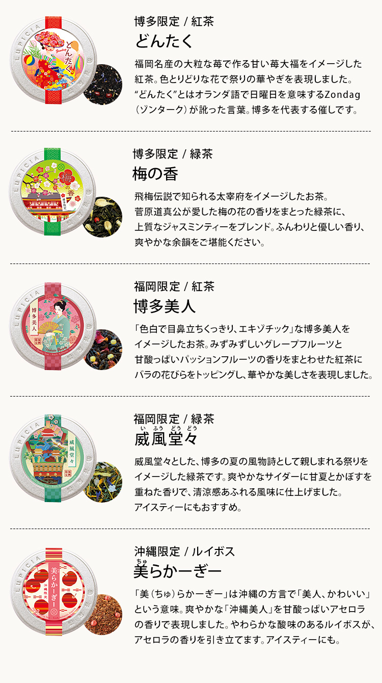 各地域の名物や風物をイメージしてつくられたお茶です。普段はイベントなどでしかご用意していない、小さな缶でご用意いたします。